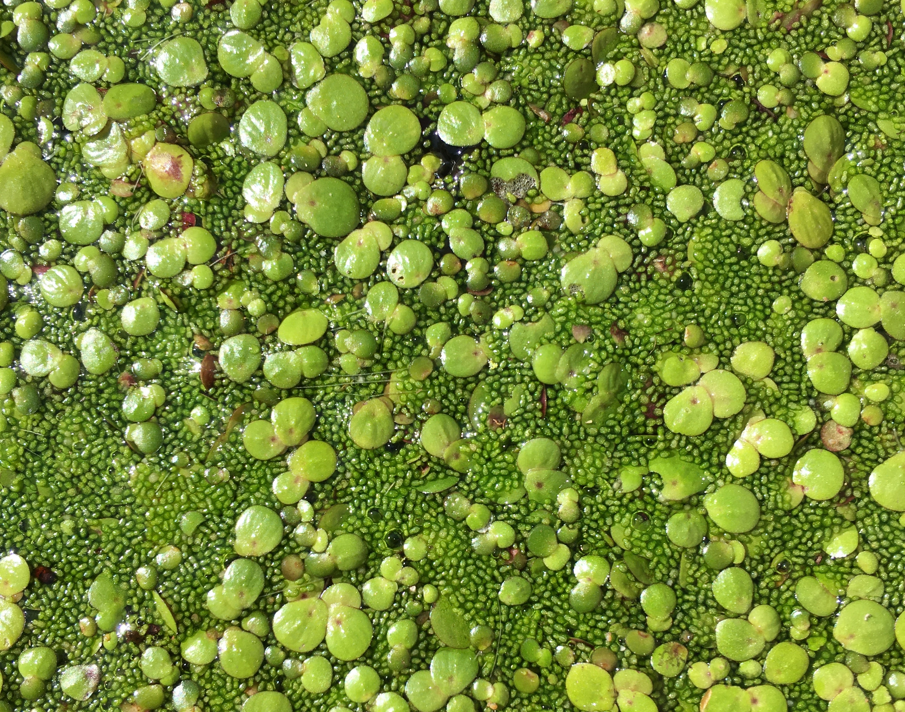 The duckweeds Spirodela polyrhiza and Wolffia globosa coexist in a pond in Durham, NC.